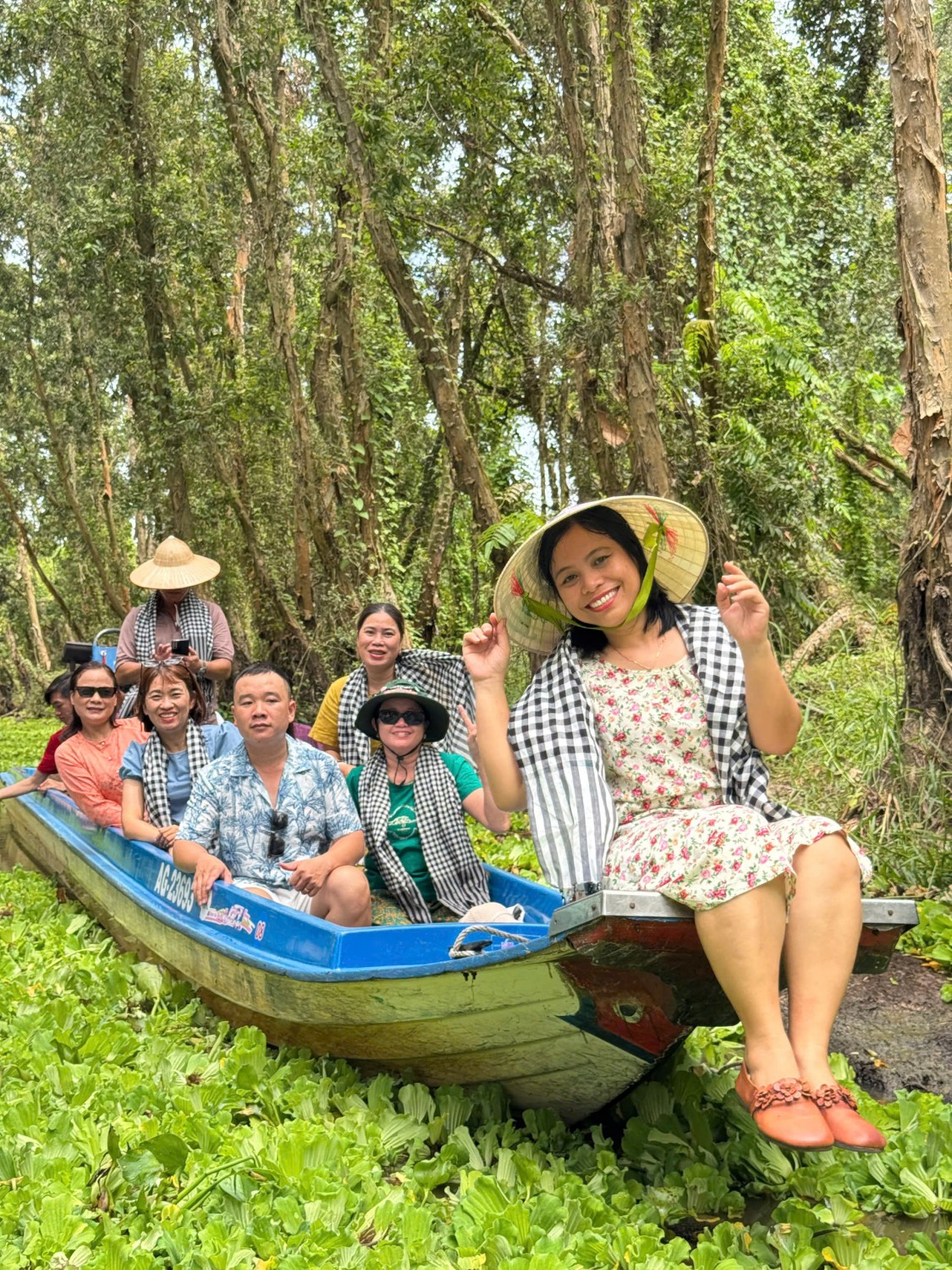 Quý khách chuyển sang đi đò chèo đây là hành trình thú vị nhất. Đò chèo nhẹ nhàng rẽ nước đi vào rừng tràm xanh mướt với khung cảnh tuyệt đẹp. Trên mặt nước phủ đầy một màu xanh lơ của những mãng bèo màu xanh như những tấm thảm khổng lồ bao phủ khắm rừng tràm. Trong không khí mát mẻ xuồng lướt đi nhè nhẹ tạo cảm giác lâng lâng khó tả, cuộc sống chậm lại, chỉ số hạnh phúc như tăng lên rỏ rệt. Quý khách như gạt bỏ những điều phiền muộng của cuộc sống, tận hưởng cảm giác sản khoái khi đi giữa thiên nhiên hoang dã tuyệt đẹp.