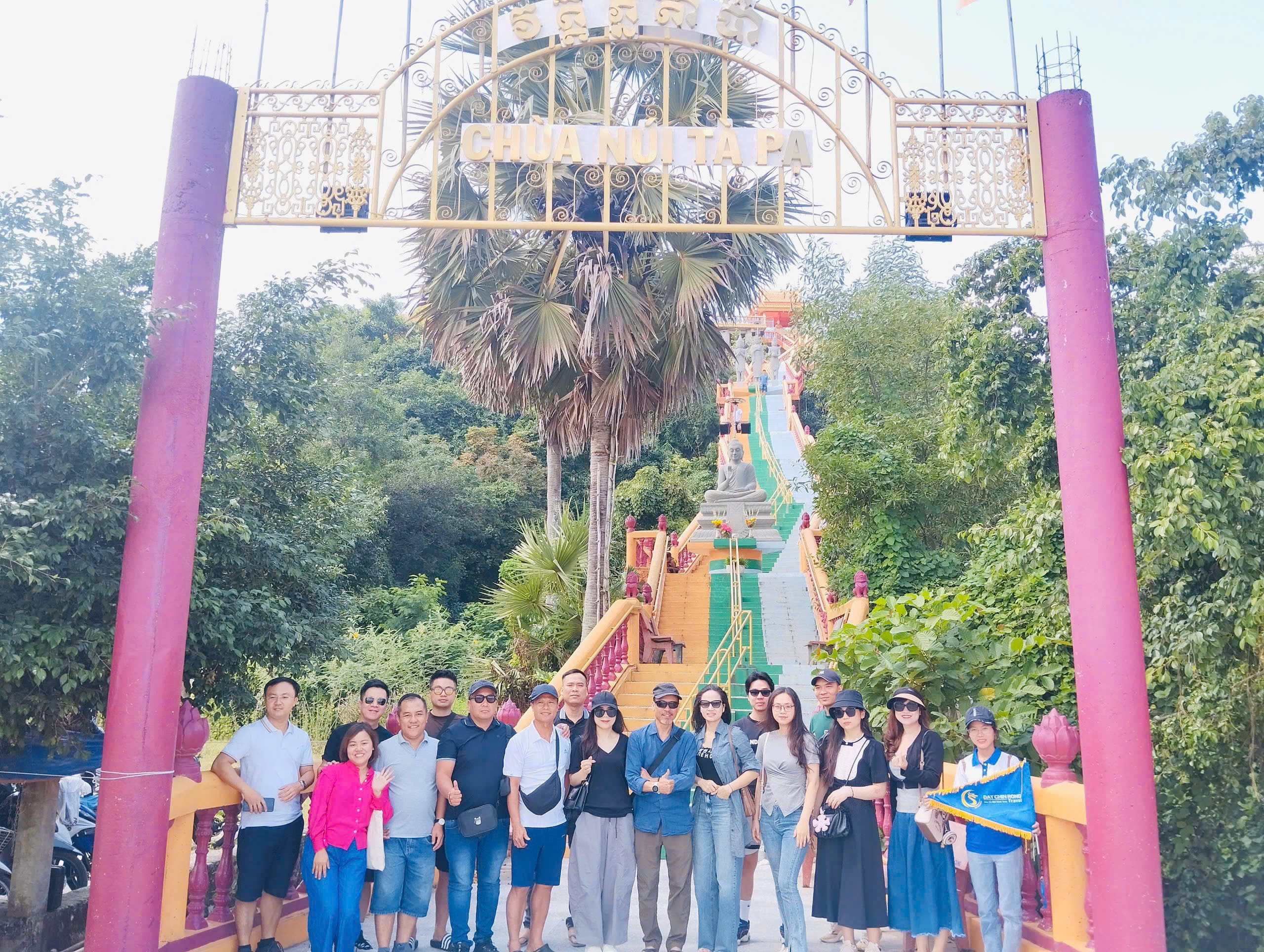 Xe đưa đoàn đi tham quan Chùa Tà Pạ Chùa còn được gọi là chùa Núi hay chùa Chưn - Num theo các gọi của người Khmer. Đến đây ngoài việc được chiêm ngưỡng kiến trúc độc đáo của chùa Tà Pạ, tiều hiểu văn hóa phật giáo Nam Tông của người Khmer, du khách sẽ được tận hưởng thiên nhiên xanh mát và tươi mới bởi ngôi chùa được xây trên đỉnh đồi Tà Pạ cao đến 45m, ngọn đồi nằm giữa cánh đồng hoang sơ và rộng lớn như phần tô điểm thêm vẻ nguy nga cho ngôi chùa.