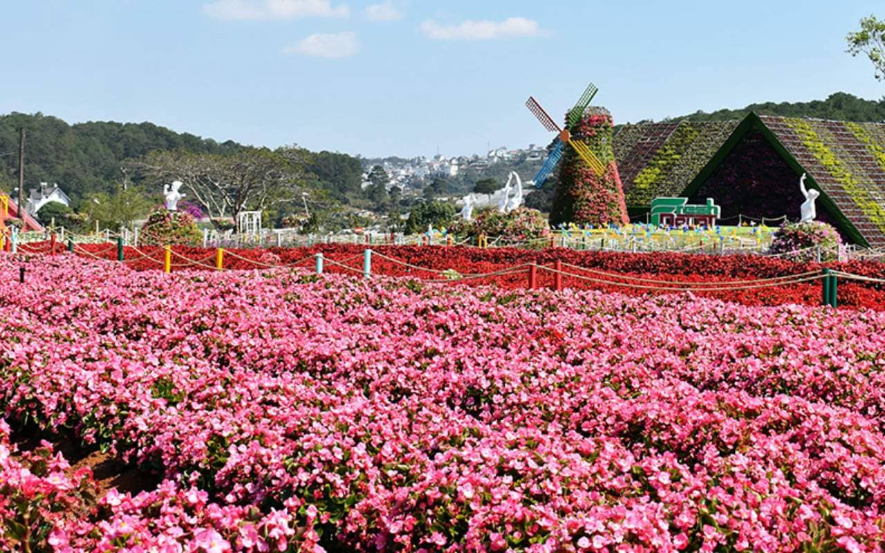 Trang trại rau và hoa Vạn Thành: du khách sẽ choáng ngợp bởi vẻ quyến rũ của bức tranh tuyệt mỹ được tạo nên bởi vô vàn các loài hoa đua nhau khoe sắc như đóa Hồng, Cẩm Chướng, Lily, Đồng Tiền, Cẩm Tú Cầu…